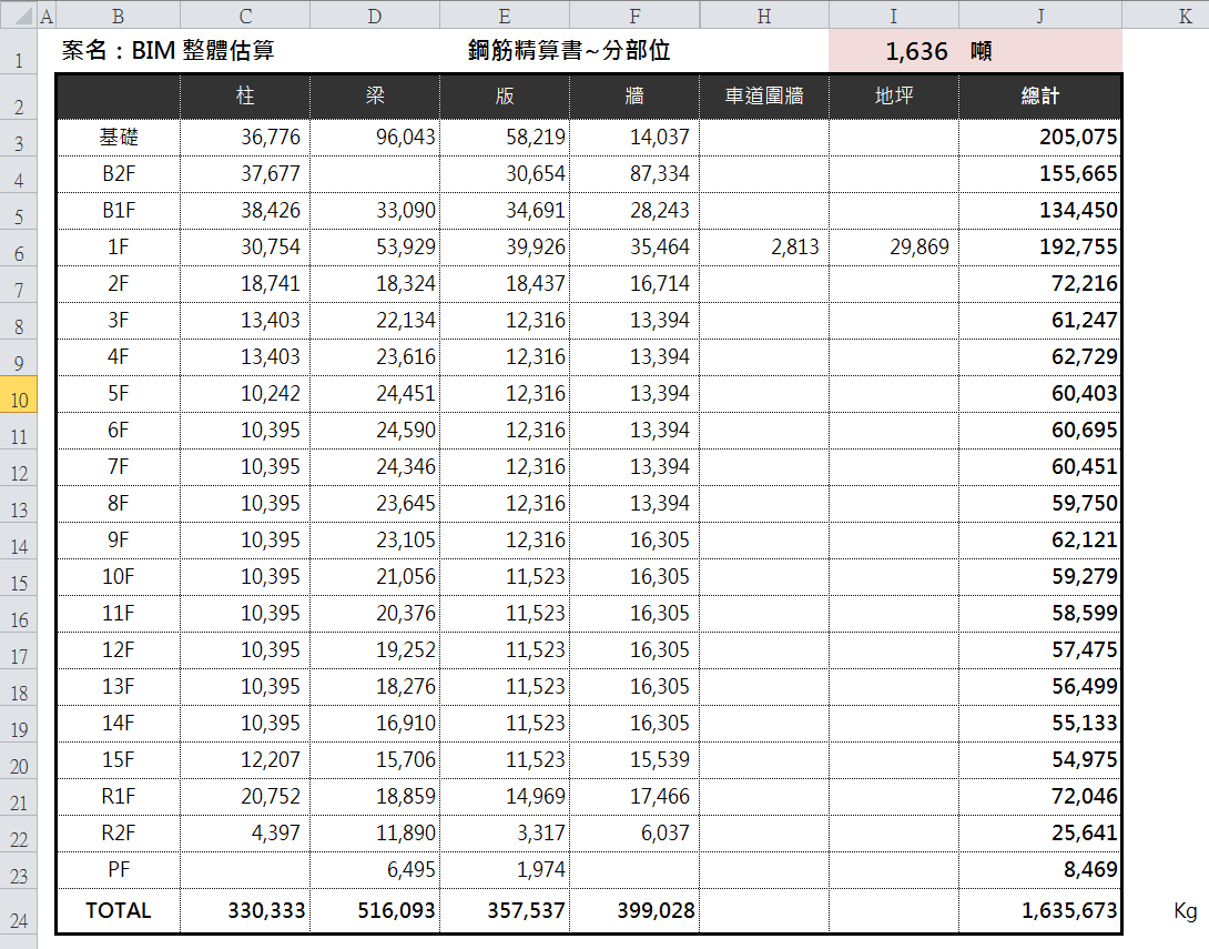 RCAD 算量服務方案與特色 為您量身打造算量方案 統包成控、營造廠、建設公司、結構設計…,我們提供最符合您需求的算量方案 BIM結構工程建模精算 鋼筋、模版、混凝土 採用獨立開發之RCAD 3D建模算量技術 3D空間檢討實際鋼筋用量 建模同步完成清圖 交付報表 【連續壁】數量明細表 【結構】工程數量摘要 【鋼筋】數量明細表(分號數/分層/分部位) 【模版】數量明細表 【混凝土】數量明細表 【結構柱續接器】明細表 BIM裝修工程算量 內飾、外裝、零星、雜項 採用廣聯達 Cubicost TAS 裝修算量 不重複建模(運用RCAD結構模型匯出IFC) 實務經驗檢核,確認各構件扣減關係合理性 交付報表 【總標單】 【清單彙總表】(依樓層) 【清單彙總表】(外牆對位) 【外部裝修彙總表】(依方向提送) RCAD 算量價值 以工地實務經驗為基礎用程式研發技術做後盾 BIM結構模型 調整模型符合工地實況建模過程一併完成清圖 上一張 下一張 精算真實需求量 工作筋不再是壓垮駱駝的最後一根稻草將工地實務經驗納入計算細節使您的估算量更接近現場施作量 上一張 下一張 上一張 下一張 衝突檢測 & 清圖報告 我們知道沒有完美的設計但我們可以幫助您的流程更加順利提供清圖報告以便釋疑釐清讓成果有憑有據 上一張 下一張 報表成果 鋼筋、模板、混凝土均提供分層數量明細表裝修部分提供裝修數量報表、工程標單、清單彙總表(對位表)