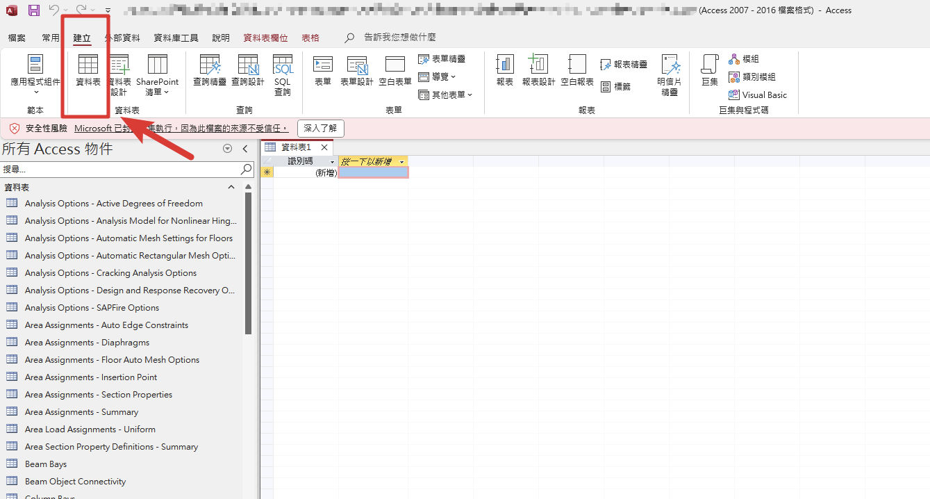 Step.1 開啟mdb/accdb檔,點擊 [建立] > [資料表]