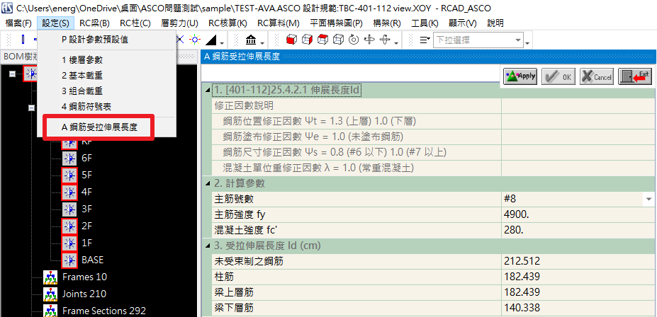 功能位置:設定(S) > 鋼筋受拉伸展長度